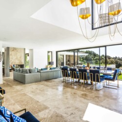 Le rez-de-chaussée se compose d’un hall d’entrée et d’un immense salon avec cheminée à foyer ouvert. Vous trouverez également à cet étage une élégante salle à manger spacieuse, un coin salon confortable, des toilettes invités et une spacieuse cuisine design ouverte et entièrement équipée. Les immenses fenêtres panoramiques et portes coulissantes ouvrent une vue imprenable sur la Méditerranée. Le salon est prolongé par une magnifique terrasse spacieuse avec piscine privée et jacuzzi.